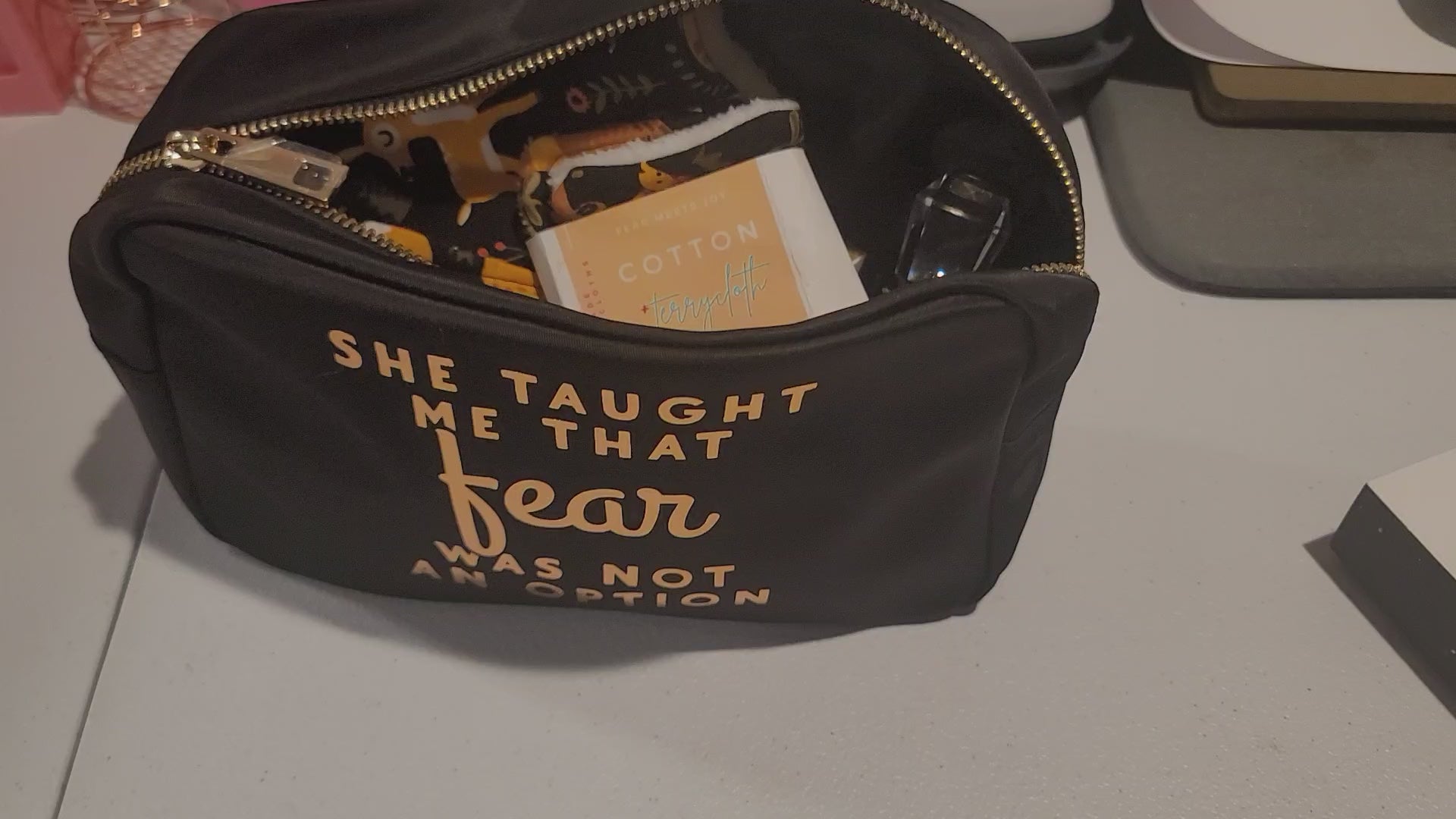 The “She Taught Me That Fear Was Not an Option” pouch features a meaningful message of resilience, thoughtfully applied to a durable, pre-made pouch and finished with a golden zipper for secure closure. Its structured yet flexible shape makes it easy to organize personal care items while fitting comfortably inside most bags.